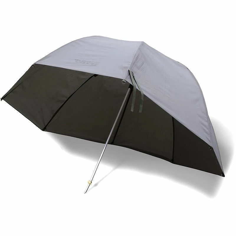 Extra-large umbrella with the popular Nubrolly concept. The shaft can be screwed in laterally and thus does not interfere in the centre under the canopy. The solid aluminium ground spike is designed to withstand the most extreme conditions and is indestructible. The oval design offers so much space that even modern carp bedchairs with a length of 2.10Â m will fit underneath. The extra robust workmanship with sealed seams and especially robust rib holders makes this umbrella very durable. Additional features such as 4 eyelets for tent pegs/tensioning ropes in the rear area as well as 4 storm pole adapters at the front round off the complete package. This umbrella is built for the most extreme situations. Inluding 4 Bivvy Pegs.
