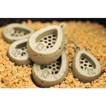 The Impact Bomb is a flat pear shaped lead with a hole in the middle of it and a mesh which bait can be pushed into, so that it will stay in during the cast, with the majority of it ending up close to your hookbait.