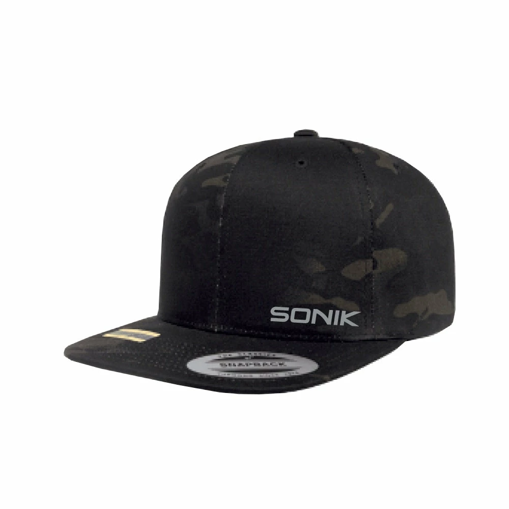 Stylish MultiCam® snap back pattern with six panel construction giving this cap plenty of rigidity. Hard buckram structured flat visor. Featuring a snap-tab size adjuster at the rear and Sonik S logo 3D embroidered.