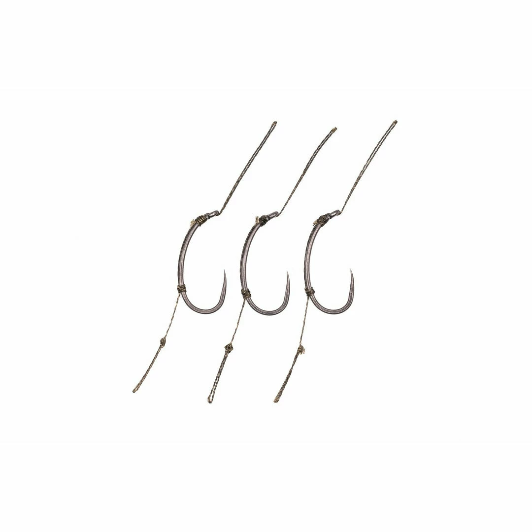They are tied using a semi-stiff braided material, and come in barbed or barbless versions, in sizes 2, 4, 6, or 8. You get three in a packet.Â