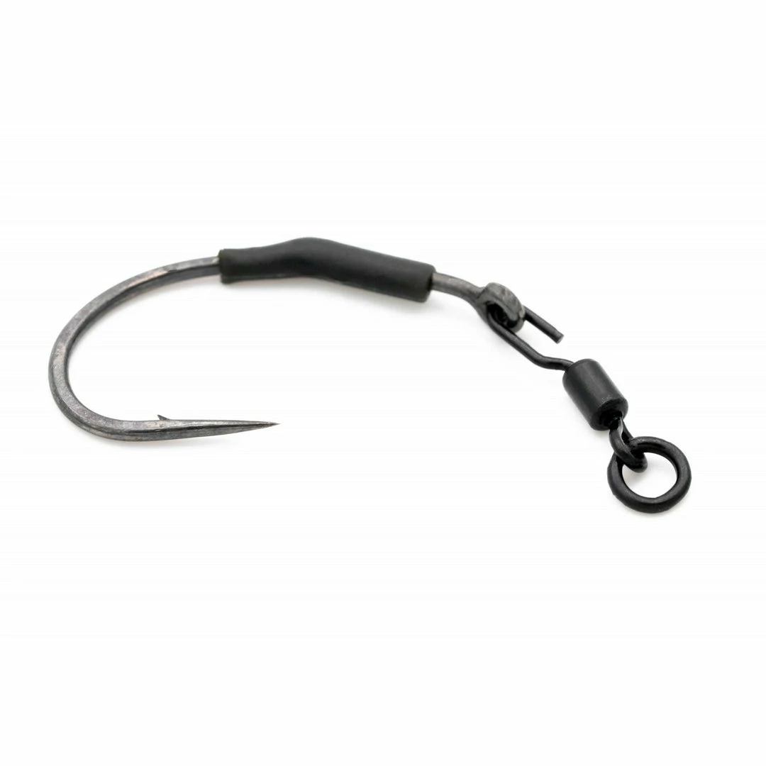 The Spinner Ring Swivel has been specifically designed for use with spinner rigs, and does away with the need to make do with other types of swivel which aren’t made for that purpose. Previously using a spinner rig often involved having to use a pair of pliers to open up a QC Swivel or similar and jam the hook onto it, but these have a crooked shape opening which the hook can easily be slid onto, and then a piece of shrink tubing or a medium Kicker is used to cover the connection and keep everything in place and sitting at the right angle. This size 11 swivel also helps to create very neat spinner boom sections, with the ring at the other end of it giving plenty of movement, and allowing you to crimp tightly to it, or if you’re using more supple materials which are being tied directly to the ring. You get ten Spinner Swivels in a pack.Â
