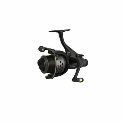 The Okuma Carbonite XP Baitfeeder Reel is loaded with 15lb green mon line. The  Okuma Carbonite XP Baitfeeder Reel comes with a spare spool and has machine cut brass pinion gear.Â