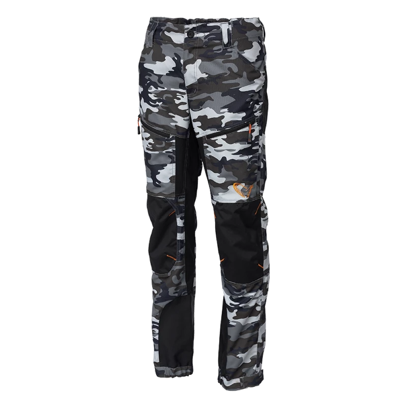 Follow-up on our Simply Savage Trousers in Grey, now in nice camo pattern • Shell fabric of strong 100% polyester taslon oxford mixed with flexible fabric of 95%nylon/5% spandex • Waterproof re-inforcement of knee, seat & inner bottom leg by 100% PU coated nylon taslon • Elasticated waist