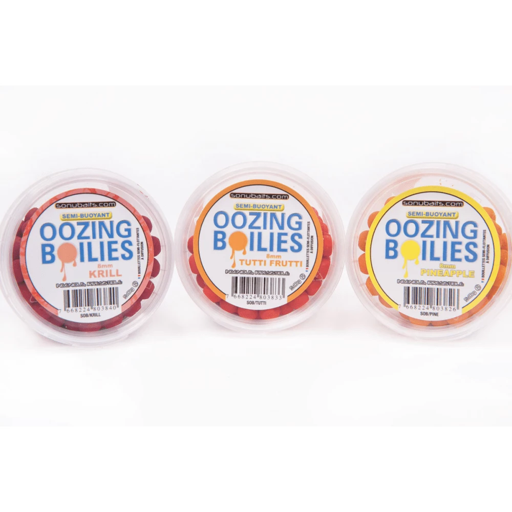 Oozing Buoyant Boilies are a new concept in match fishing, they are filled with high leakage feeding stimulators which creates a mist of attraction directly around the hookbait, and because they are buoyant the mist of feeding attraction that drops from the bait settles around the feeder. They are the perfect texture to be hair rigged or used with a bayonet.