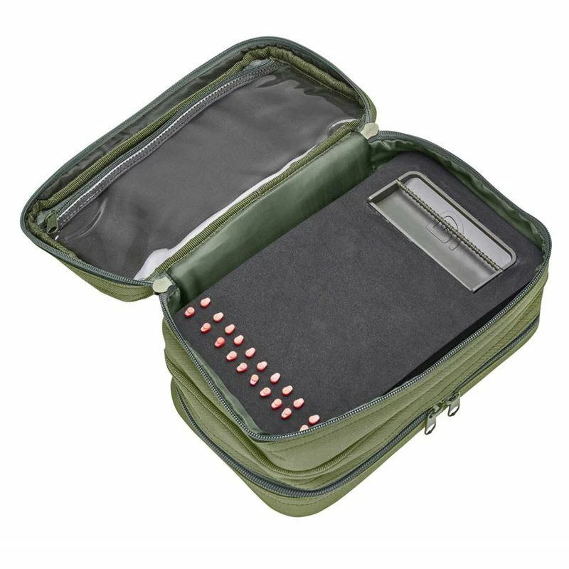 This dual sided rig and tackle pouch allows for easy access to your terminal tackle items and allows you to keep everything organised and a neat and tidy way thanks to the zipped internal clear pockets, along with Velcro foam disks which are ideal for storing zigs or even long hooklinks for floater fishing. On the other side, there is an EVA rig board with a moulded rig bar and Hi-Viz rig pins to keep your rigs straight and organised all at the same time.